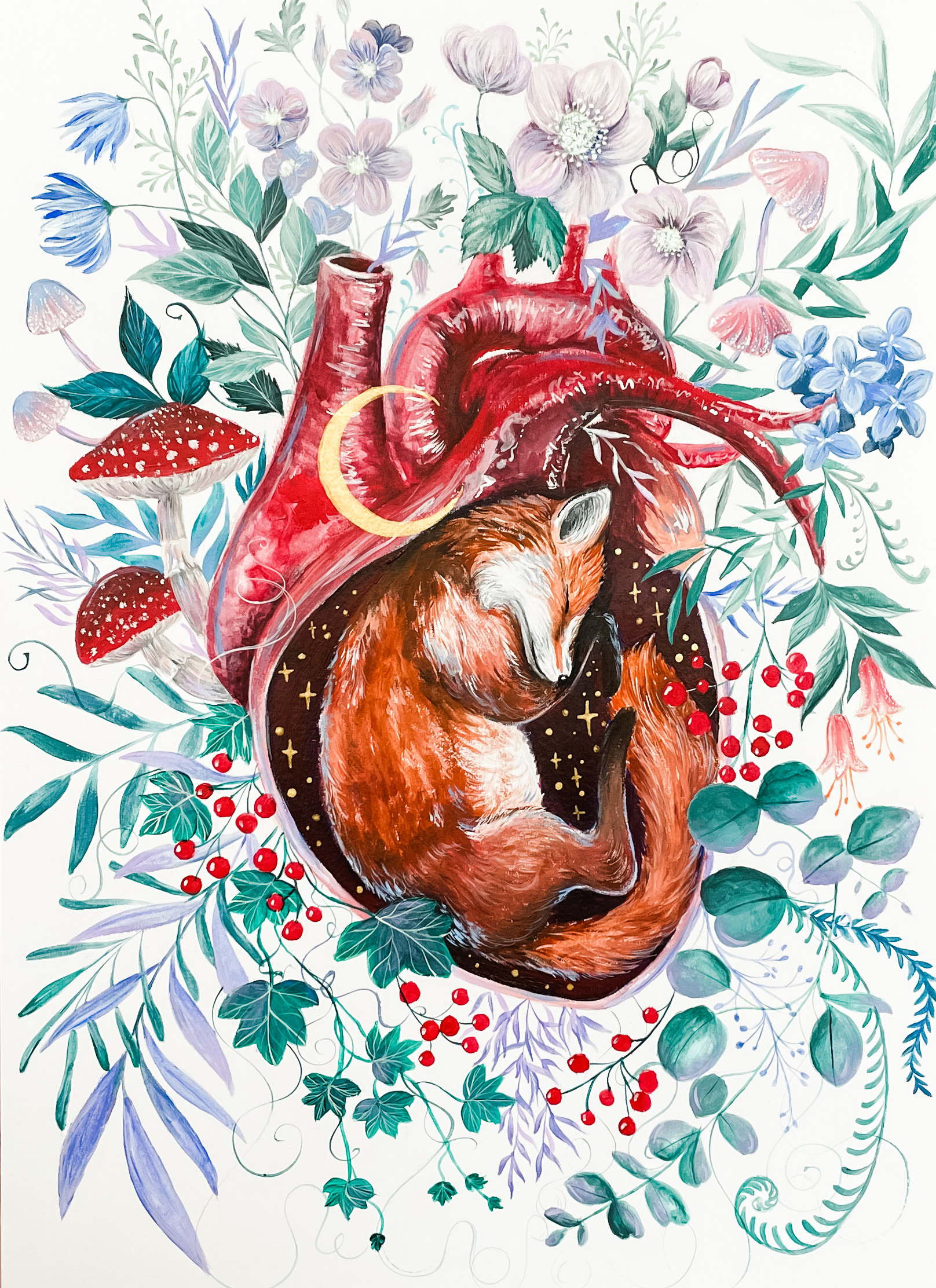 Next, we can explore a deeper connection in “Heart of the Wild.” This piece intimately explores the bond between our inner selves and the natural world. In the heart’s very center, a gentle fox sleeps soundly. Surrounding it, you will find a vibrant ecosystem of mushrooms and wildflowers. Therefore, this entire scene symbolizes the beautiful vulnerability we all carry. Equally important, it suggests that our deepest emotions are forever linked to the earth’s own wild rhythm. Isn’t it wonderful to imagine your heart offering a sanctuary to nature itself?